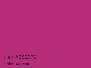 Hex #b82d79 Color is a normal magenta color and the nearest color is Hibiscus #b6316c. Hex code #b82d79 and RGB value is rgb(184,45,121). In RGB color space, this color is composed of 72% red, 18% green, 47% blue, In CMYK color space, this color is composed of 0% cyan, 76% magenta, 34% yellow , 28% black , In HSL color space, this color has a hue angle of 327° , 61% saturation and 45% lightness.