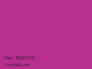 Hex #b82f91 Color is a normal magenta color and the nearest color is Fandango #b53389. Hex code #b82f91 and RGB value is rgb(184,47,145). In RGB color space, this color is composed of 72% red, 18% green, 57% blue, In CMYK color space, this color is composed of 0% cyan, 74% magenta, 21% yellow , 28% black , In HSL color space, this color has a hue angle of 317° , 59% saturation and 45% lightness.