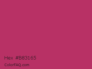 Hex #b83165 Color is a normal rose color and the nearest color is Hibiscus #b6316c. Hex code #b83165 and RGB value is rgb(184,49,101). In RGB color space, this color is composed of 72% red, 19% green, 40% blue, In CMYK color space, this color is composed of 0% cyan, 73% magenta, 45% yellow , 28% black , In HSL color space, this color has a hue angle of 337° , 58% saturation and 46% lightness.