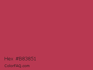 Hex #b83851 Color is a normal red color and the nearest color is Dingy Dungeon #c53151. Hex code #b83851 and RGB value is rgb(184,56,81). In RGB color space, this color is composed of 72% red, 22% green, 32% blue, In CMYK color space, this color is composed of 0% cyan, 70% magenta, 56% yellow , 28% black , In HSL color space, this color has a hue angle of 348° , 53% saturation and 47% lightness.