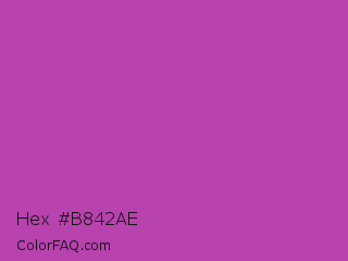 Hex #b842ae Color is a normal magenta color and the nearest color is Byzantine #bd33a4. Hex code #b842ae and RGB value is rgb(184,66,174). In RGB color space, this color is composed of 72% red, 26% green, 68% blue, In CMYK color space, this color is composed of 0% cyan, 64% magenta, 5% yellow , 28% black , In HSL color space, this color has a hue angle of 305° , 47% saturation and 49% lightness.