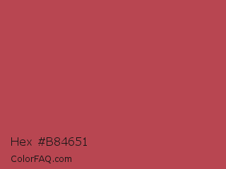 Hex #b84651 Color is a normal red color and the nearest color is Bittersweet Shimmer #bf4f51. Hex code #b84651 and RGB value is rgb(184,70,81). In RGB color space, this color is composed of 72% red, 27% green, 32% blue, In CMYK color space, this color is composed of 0% cyan, 62% magenta, 56% yellow , 28% black , In HSL color space, this color has a hue angle of 354° , 45% saturation and 50% lightness.