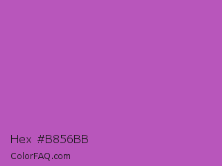 Hex #b856bb Color is a normal magenta color and the nearest color is Fuchsia Pink #c154c1. Hex code #b856bb and RGB value is rgb(184,86,187). In RGB color space, this color is composed of 72% red, 34% green, 73% blue, In CMYK color space, this color is composed of 2% cyan, 54% magenta, 0% yellow , 27% black , In HSL color space, this color has a hue angle of 298° , 43% saturation and 54% lightness.