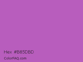 Hex #b85dbd Color is a normal magenta color and the nearest color is Fuchsia Pink #c154c1. Hex code #b85dbd and RGB value is rgb(184,93,189). In RGB color space, this color is composed of 72% red, 36% green, 74% blue, In CMYK color space, this color is composed of 3% cyan, 51% magenta, 0% yellow , 26% black , In HSL color space, this color has a hue angle of 297° , 42% saturation and 55% lightness.