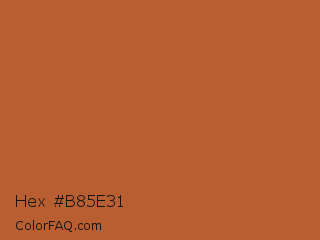 Hex #b85e31 Color is a normal orange color and the nearest color is Tuscany #bd5e2e. Hex code #b85e31 and RGB value is rgb(184,94,49). In RGB color space, this color is composed of 72% red, 37% green, 19% blue, In CMYK color space, this color is composed of 0% cyan, 49% magenta, 73% yellow , 28% black , In HSL color space, this color has a hue angle of 20° , 58% saturation and 46% lightness.