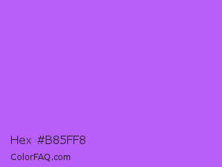 Hex #b85ff8 Color is a light purple color and the nearest color is Medium Orchid #ba55d3. Hex code #b85ff8 and RGB value is rgb(184,95,248). In RGB color space, this color is composed of 72% red, 37% green, 97% blue, In CMYK color space, this color is composed of 26% cyan, 62% magenta, 0% yellow , 3% black , In HSL color space, this color has a hue angle of 275° , 92% saturation and 67% lightness.
