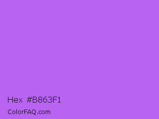 Hex #b863f1 Color is a light purple color and the nearest color is Rich Lilac #b666d2. Hex code #b863f1 and RGB value is rgb(184,99,241). In RGB color space, this color is composed of 72% red, 39% green, 95% blue, In CMYK color space, this color is composed of 24% cyan, 59% magenta, 0% yellow , 5% black , In HSL color space, this color has a hue angle of 276° , 84% saturation and 67% lightness.