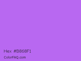 Hex #b868f1 Color is a light purple color and the nearest color is Lavender #b57edc. Hex code #b868f1 and RGB value is rgb(184,104,241). In RGB color space, this color is composed of 72% red, 41% green, 95% blue, In CMYK color space, this color is composed of 24% cyan, 57% magenta, 0% yellow , 5% black , In HSL color space, this color has a hue angle of 275° , 83% saturation and 68% lightness.
