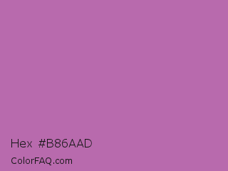Hex #b86aad Color is a normal magenta color and the nearest color is Pearly Purple #b768a2. Hex code #b86aad and RGB value is rgb(184,106,173). In RGB color space, this color is composed of 72% red, 42% green, 68% blue, In CMYK color space, this color is composed of 0% cyan, 42% magenta, 6% yellow , 28% black , In HSL color space, this color has a hue angle of 308° , 35% saturation and 57% lightness.