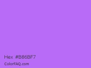 Hex #b86bf7 Color is a light purple color and the nearest color is Lavender #b57edc. Hex code #b86bf7 and RGB value is rgb(184,107,247). In RGB color space, this color is composed of 72% red, 42% green, 97% blue, In CMYK color space, this color is composed of 26% cyan, 57% magenta, 0% yellow , 3% black , In HSL color space, this color has a hue angle of 273° , 90% saturation and 69% lightness.