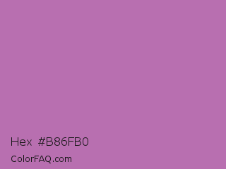 Hex #b86fb0 Color is a normal magenta color and the nearest color is Pearly Purple #b768a2. Hex code #b86fb0 and RGB value is rgb(184,111,176). In RGB color space, this color is composed of 72% red, 44% green, 69% blue, In CMYK color space, this color is composed of 0% cyan, 40% magenta, 4% yellow , 28% black , In HSL color space, this color has a hue angle of 307° , 34% saturation and 58% lightness.