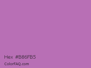 Hex #b86fb5 Color is a normal magenta color and the nearest color is Pearly Purple #b768a2. Hex code #b86fb5 and RGB value is rgb(184,111,181). In RGB color space, this color is composed of 72% red, 44% green, 71% blue, In CMYK color space, this color is composed of 0% cyan, 40% magenta, 2% yellow , 28% black , In HSL color space, this color has a hue angle of 302° , 34% saturation and 58% lightness.