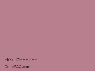 Hex #b8808e Color is a light red color and the nearest color is English Lavender #b48395. Hex code #b8808e and RGB value is rgb(184,128,142). In RGB color space, this color is composed of 72% red, 50% green, 56% blue, In CMYK color space, this color is composed of 0% cyan, 30% magenta, 23% yellow , 28% black , In HSL color space, this color has a hue angle of 345° , 28% saturation and 61% lightness.