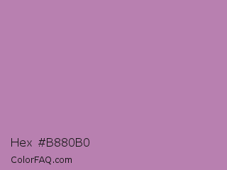 Hex #b880b0 Color is a light magenta color and the nearest color is Opera Mauve #b784a7. Hex code #b880b0 and RGB value is rgb(184,128,176). In RGB color space, this color is composed of 72% red, 50% green, 69% blue, In CMYK color space, this color is composed of 0% cyan, 30% magenta, 4% yellow , 28% black , In HSL color space, this color has a hue angle of 309° , 28% saturation and 61% lightness.