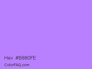 Hex #b880fe Color is a light violet color and the nearest color is Pale Violet #cc99ff. Hex code #b880fe and RGB value is rgb(184,128,254). In RGB color space, this color is composed of 72% red, 50% green, 100% blue, In CMYK color space, this color is composed of 28% cyan, 50% magenta, 0% yellow , 0% black , In HSL color space, this color has a hue angle of 267° , 98% saturation and 75% lightness.