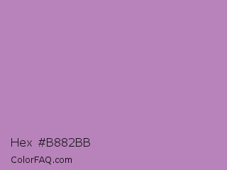 Hex #b882bb Color is a light magenta color and the nearest color is African Violet #b284be. Hex code #b882bb and RGB value is rgb(184,130,187). In RGB color space, this color is composed of 72% red, 51% green, 73% blue, In CMYK color space, this color is composed of 2% cyan, 30% magenta, 0% yellow , 27% black , In HSL color space, this color has a hue angle of 297° , 30% saturation and 62% lightness.