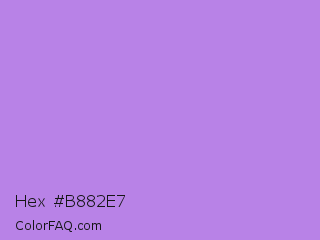 Hex #b882e7 Color is a light purple color and the nearest color is Lavender #b57edc. Hex code #b882e7 and RGB value is rgb(184,130,231). In RGB color space, this color is composed of 72% red, 51% green, 91% blue, In CMYK color space, this color is composed of 20% cyan, 44% magenta, 0% yellow , 9% black , In HSL color space, this color has a hue angle of 272° , 68% saturation and 71% lightness.