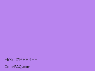 Hex #b884ef Color is a light violet color and the nearest color is Lavender #b57edc. Hex code #b884ef and RGB value is rgb(184,132,239). In RGB color space, this color is composed of 72% red, 52% green, 94% blue, In CMYK color space, this color is composed of 23% cyan, 45% magenta, 0% yellow , 6% black , In HSL color space, this color has a hue angle of 269° , 77% saturation and 73% lightness.