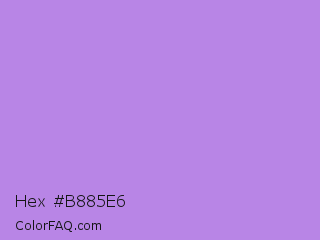 Hex #b885e6 Color is a light purple color and the nearest color is Lavender #b57edc. Hex code #b885e6 and RGB value is rgb(184,133,230). In RGB color space, this color is composed of 72% red, 52% green, 90% blue, In CMYK color space, this color is composed of 20% cyan, 42% magenta, 0% yellow , 10% black , In HSL color space, this color has a hue angle of 272° , 66% saturation and 71% lightness.