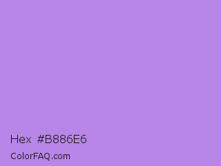 Hex #b886e6 Color is a light purple color and the nearest color is Lavender #b57edc. Hex code #b886e6 and RGB value is rgb(184,134,230). In RGB color space, this color is composed of 72% red, 53% green, 90% blue, In CMYK color space, this color is composed of 20% cyan, 42% magenta, 0% yellow , 10% black , In HSL color space, this color has a hue angle of 271° , 66% saturation and 71% lightness.