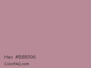 Hex #b88996 Color is a light rose color and the nearest color is English Lavender #b48395. Hex code #b88996 and RGB value is rgb(184,137,150). In RGB color space, this color is composed of 72% red, 54% green, 59% blue, In CMYK color space, this color is composed of 0% cyan, 26% magenta, 18% yellow , 28% black , In HSL color space, this color has a hue angle of 343° , 25% saturation and 63% lightness.