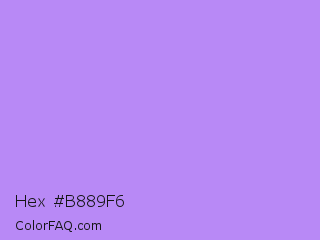 Hex #b889f6 Color is a light violet color and the nearest color is Bright Lavender #bf94e4. Hex code #b889f6 and RGB value is rgb(184,137,246). In RGB color space, this color is composed of 72% red, 54% green, 96% blue, In CMYK color space, this color is composed of 25% cyan, 44% magenta, 0% yellow , 4% black , In HSL color space, this color has a hue angle of 266° , 86% saturation and 75% lightness.