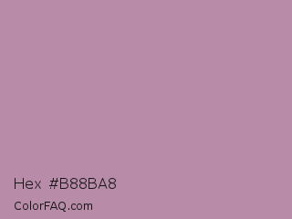Hex #b88ba8 Color is a light magenta color and the nearest color is Opera Mauve #b784a7. Hex code #b88ba8 and RGB value is rgb(184,139,168). In RGB color space, this color is composed of 72% red, 55% green, 66% blue, In CMYK color space, this color is composed of 0% cyan, 24% magenta, 9% yellow , 28% black , In HSL color space, this color has a hue angle of 321° , 24% saturation and 63% lightness.