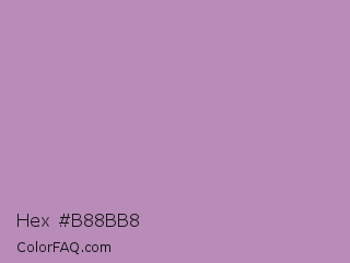 Hex #b88bb8 Color is a light magenta color and the nearest color is African Violet #b284be. Hex code #b88bb8 and RGB value is rgb(184,139,184). In RGB color space, this color is composed of 72% red, 55% green, 72% blue, In CMYK color space, this color is composed of 0% cyan, 24% magenta, 0% yellow , 28% black , In HSL color space, this color has a hue angle of 300° , 24% saturation and 63% lightness.