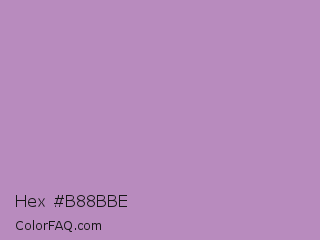 Hex #b88bbe Color is a light magenta color and the nearest color is African Violet #b284be. Hex code #b88bbe and RGB value is rgb(184,139,190). In RGB color space, this color is composed of 72% red, 55% green, 75% blue, In CMYK color space, this color is composed of 3% cyan, 27% magenta, 0% yellow , 25% black , In HSL color space, this color has a hue angle of 293° , 28% saturation and 65% lightness.