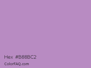 Hex #b88bc2 Color is a light purple color and the nearest color is African Violet #b284be. Hex code #b88bc2 and RGB value is rgb(184,139,194). In RGB color space, this color is composed of 72% red, 55% green, 76% blue, In CMYK color space, this color is composed of 5% cyan, 28% magenta, 0% yellow , 24% black , In HSL color space, this color has a hue angle of 289° , 31% saturation and 65% lightness.