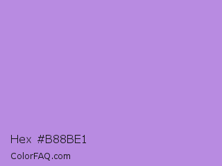 Hex #b88be1 Color is a light purple color and the nearest color is Bright Lavender #bf94e4. Hex code #b88be1 and RGB value is rgb(184,139,225). In RGB color space, this color is composed of 72% red, 55% green, 88% blue, In CMYK color space, this color is composed of 18% cyan, 38% magenta, 0% yellow , 12% black , In HSL color space, this color has a hue angle of 271° , 59% saturation and 71% lightness.