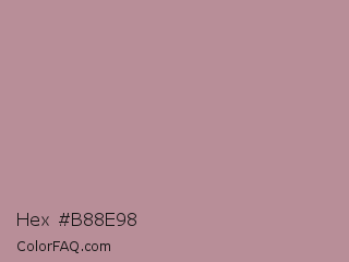 Hex #b88e98 Color is a light red color and the nearest color is Rosy Brown #bc8f8f. Hex code #b88e98 and RGB value is rgb(184,142,152). In RGB color space, this color is composed of 72% red, 56% green, 60% blue, In CMYK color space, this color is composed of 0% cyan, 23% magenta, 17% yellow , 28% black , In HSL color space, this color has a hue angle of 346° , 23% saturation and 64% lightness.