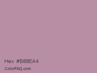 Hex #b88ea4 Color is a light rose color and the nearest color is Opera Mauve #b784a7. Hex code #b88ea4 and RGB value is rgb(184,142,164). In RGB color space, this color is composed of 72% red, 56% green, 64% blue, In CMYK color space, this color is composed of 0% cyan, 23% magenta, 11% yellow , 28% black , In HSL color space, this color has a hue angle of 329° , 23% saturation and 64% lightness.