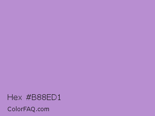 Hex #b88ed1 Color is a light purple color and the nearest color is East Side #ac91ce. Hex code #b88ed1 and RGB value is rgb(184,142,209). In RGB color space, this color is composed of 72% red, 56% green, 82% blue, In CMYK color space, this color is composed of 12% cyan, 32% magenta, 0% yellow , 18% black , In HSL color space, this color has a hue angle of 278° , 42% saturation and 69% lightness.