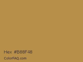 Hex #b88f48 Color is a normal orange color and the nearest color is Driftwood #af8751. Hex code #b88f48 and RGB value is rgb(184,143,72). In RGB color space, this color is composed of 72% red, 56% green, 28% blue, In CMYK color space, this color is composed of 0% cyan, 22% magenta, 61% yellow , 28% black , In HSL color space, this color has a hue angle of 38° , 44% saturation and 50% lightness.