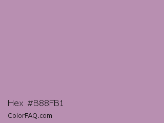Hex #b88fb1 Color is a light magenta color and the nearest color is Glossy Grape #ab92b3. Hex code #b88fb1 and RGB value is rgb(184,143,177). In RGB color space, this color is composed of 72% red, 56% green, 69% blue, In CMYK color space, this color is composed of 0% cyan, 22% magenta, 4% yellow , 28% black , In HSL color space, this color has a hue angle of 310° , 22% saturation and 64% lightness.
