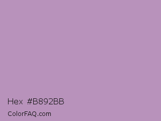 Hex #b892bb Color is a light magenta color and the nearest color is Pastel Purple #b39eb5. Hex code #b892bb and RGB value is rgb(184,146,187). In RGB color space, this color is composed of 72% red, 57% green, 73% blue, In CMYK color space, this color is composed of 2% cyan, 22% magenta, 0% yellow , 27% black , In HSL color space, this color has a hue angle of 296° , 23% saturation and 65% lightness.