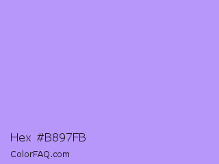 Hex #b897fb Color is a light indigo color and the nearest color is Pale Violet #cc99ff. Hex code #b897fb and RGB value is rgb(184,151,251). In RGB color space, this color is composed of 72% red, 59% green, 98% blue, In CMYK color space, this color is composed of 27% cyan, 40% magenta, 0% yellow , 2% black , In HSL color space, this color has a hue angle of 260° , 93% saturation and 79% lightness.