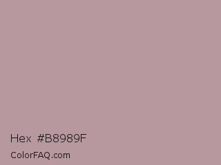 Hex #b8989f Color is a light red color and the nearest color is Thatch #b69d98. Hex code #b8989f and RGB value is rgb(184,152,159). In RGB color space, this color is composed of 72% red, 60% green, 62% blue, In CMYK color space, this color is composed of 0% cyan, 17% magenta, 14% yellow , 28% black , In HSL color space, this color has a hue angle of 347° , 18% saturation and 66% lightness.