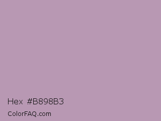 Hex #b898b3 Color is a light magenta color and the nearest color is Pastel Purple #b39eb5. Hex code #b898b3 and RGB value is rgb(184,152,179). In RGB color space, this color is composed of 72% red, 60% green, 70% blue, In CMYK color space, this color is composed of 0% cyan, 17% magenta, 3% yellow , 28% black , In HSL color space, this color has a hue angle of 309° , 18% saturation and 66% lightness.