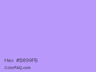 Hex #b899fb Color is a light indigo color and the nearest color is Biloba Flower #b2a1ea. Hex code #b899fb and RGB value is rgb(184,153,251). In RGB color space, this color is composed of 72% red, 60% green, 98% blue, In CMYK color space, this color is composed of 27% cyan, 39% magenta, 0% yellow , 2% black , In HSL color space, this color has a hue angle of 259° , 92% saturation and 79% lightness.