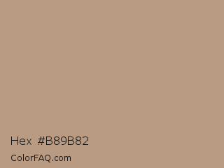 Hex #b89b82 Color is a light orange color and the nearest color is Pale Taupe #bc987e. Hex code #b89b82 and RGB value is rgb(184,155,130). In RGB color space, this color is composed of 72% red, 61% green, 51% blue, In CMYK color space, this color is composed of 0% cyan, 16% magenta, 29% yellow , 28% black , In HSL color space, this color has a hue angle of 28° , 28% saturation and 62% lightness.