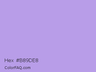 Hex #b89de8 Color is a light violet color and the nearest color is Biloba Flower #b2a1ea. Hex code #b89de8 and RGB value is rgb(184,157,232). In RGB color space, this color is composed of 72% red, 62% green, 91% blue, In CMYK color space, this color is composed of 21% cyan, 32% magenta, 0% yellow , 9% black , In HSL color space, this color has a hue angle of 262° , 62% saturation and 76% lightness.