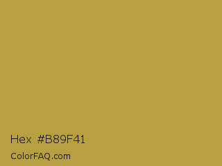 Hex #b89f41 Color is a normal yellow color and the nearest color is Brass #b5a642. Hex code #b89f41 and RGB value is rgb(184,159,65). In RGB color space, this color is composed of 72% red, 62% green, 25% blue, In CMYK color space, this color is composed of 0% cyan, 14% magenta, 65% yellow , 28% black , In HSL color space, this color has a hue angle of 47° , 48% saturation and 49% lightness.
