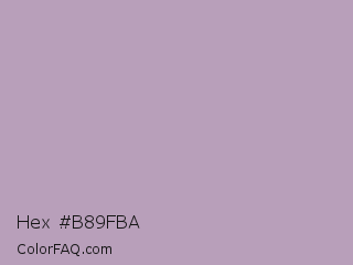 Hex #b89fba Color is a light magenta color and the nearest color is Pastel Purple #b39eb5. Hex code #b89fba and RGB value is rgb(184,159,186). In RGB color space, this color is composed of 72% red, 62% green, 73% blue, In CMYK color space, this color is composed of 1% cyan, 15% magenta, 0% yellow , 27% black , In HSL color space, this color has a hue angle of 296° , 16% saturation and 68% lightness.