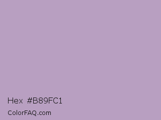 Hex #b89fc1 Color is a light purple color and the nearest color is London Hue #bea6c3. Hex code #b89fc1 and RGB value is rgb(184,159,193). In RGB color space, this color is composed of 72% red, 62% green, 76% blue, In CMYK color space, this color is composed of 5% cyan, 18% magenta, 0% yellow , 24% black , In HSL color space, this color has a hue angle of 284° , 22% saturation and 69% lightness.