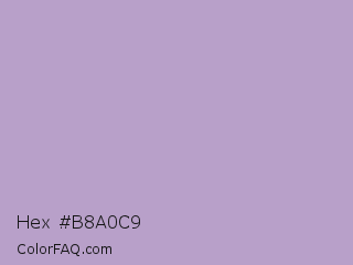 Hex #b8a0c9 Color is a light purple color and the nearest color is London Hue #bea6c3. Hex code #b8a0c9 and RGB value is rgb(184,160,201). In RGB color space, this color is composed of 72% red, 63% green, 79% blue, In CMYK color space, this color is composed of 8% cyan, 20% magenta, 0% yellow , 21% black , In HSL color space, this color has a hue angle of 275° , 28% saturation and 71% lightness.