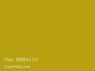 Hex #b8a110 Color is a normal yellow color and the nearest color is Sahara #b7a214. Hex code #b8a110 and RGB value is rgb(184,161,16). In RGB color space, this color is composed of 72% red, 63% green, 6% blue, In CMYK color space, this color is composed of 0% cyan, 13% magenta, 91% yellow , 28% black , In HSL color space, this color has a hue angle of 52° , 84% saturation and 39% lightness.