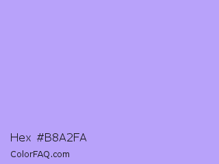Hex #b8a2fa Color is a very light indigo color and the nearest color is Biloba Flower #b2a1ea. Hex code #b8a2fa and RGB value is rgb(184,162,250). In RGB color space, this color is composed of 72% red, 64% green, 98% blue, In CMYK color space, this color is composed of 26% cyan, 35% magenta, 0% yellow , 2% black , In HSL color space, this color has a hue angle of 255° , 90% saturation and 81% lightness.