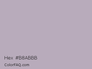 Hex #b8abbb Color is a light purple color and the nearest color is London Hue #bea6c3. Hex code #b8abbb and RGB value is rgb(184,171,187). In RGB color space, this color is composed of 72% red, 67% green, 73% blue, In CMYK color space, this color is composed of 2% cyan, 9% magenta, 0% yellow , 27% black , In HSL color space, this color has a hue angle of 289° , 11% saturation and 70% lightness.